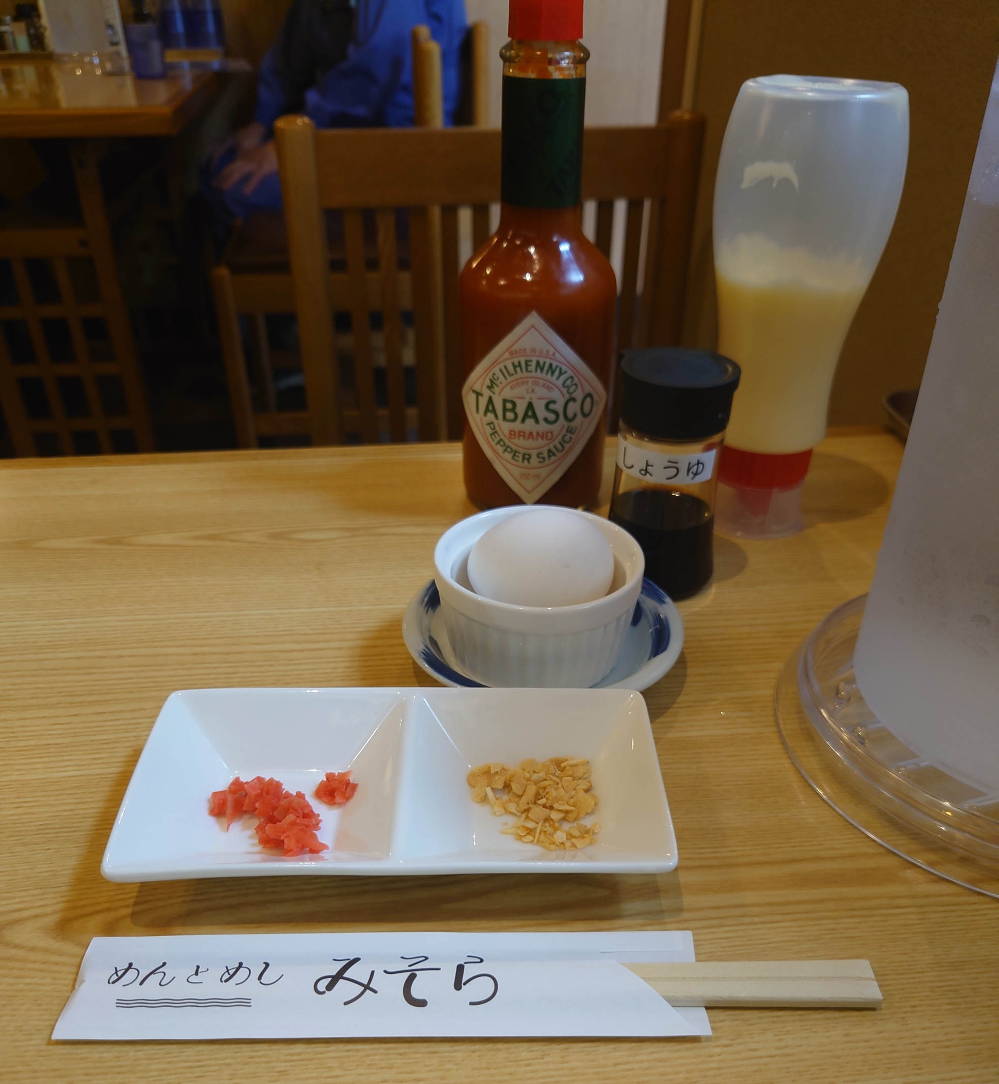 最初に生卵。そして味変用に、フライドガーリック+紅生姜+タバスコ+マヨネーズ+醤油がサーブ。