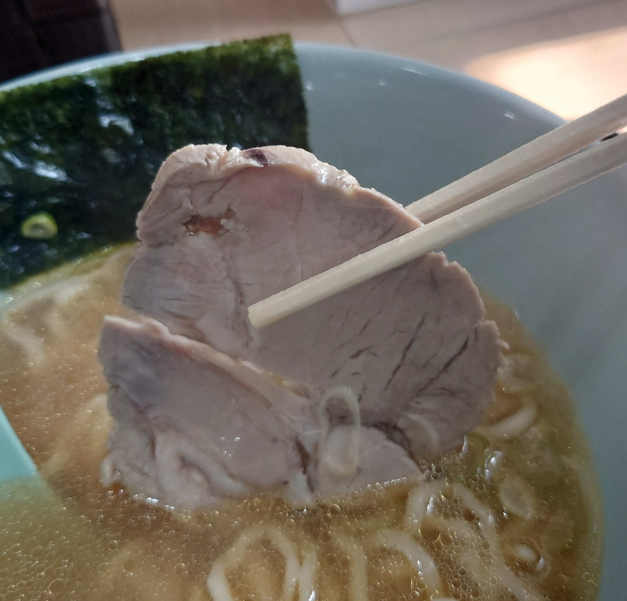 温度も熱々で申し分なし!。そして、表面に浮かぶ鶏油が旨味を増しています。