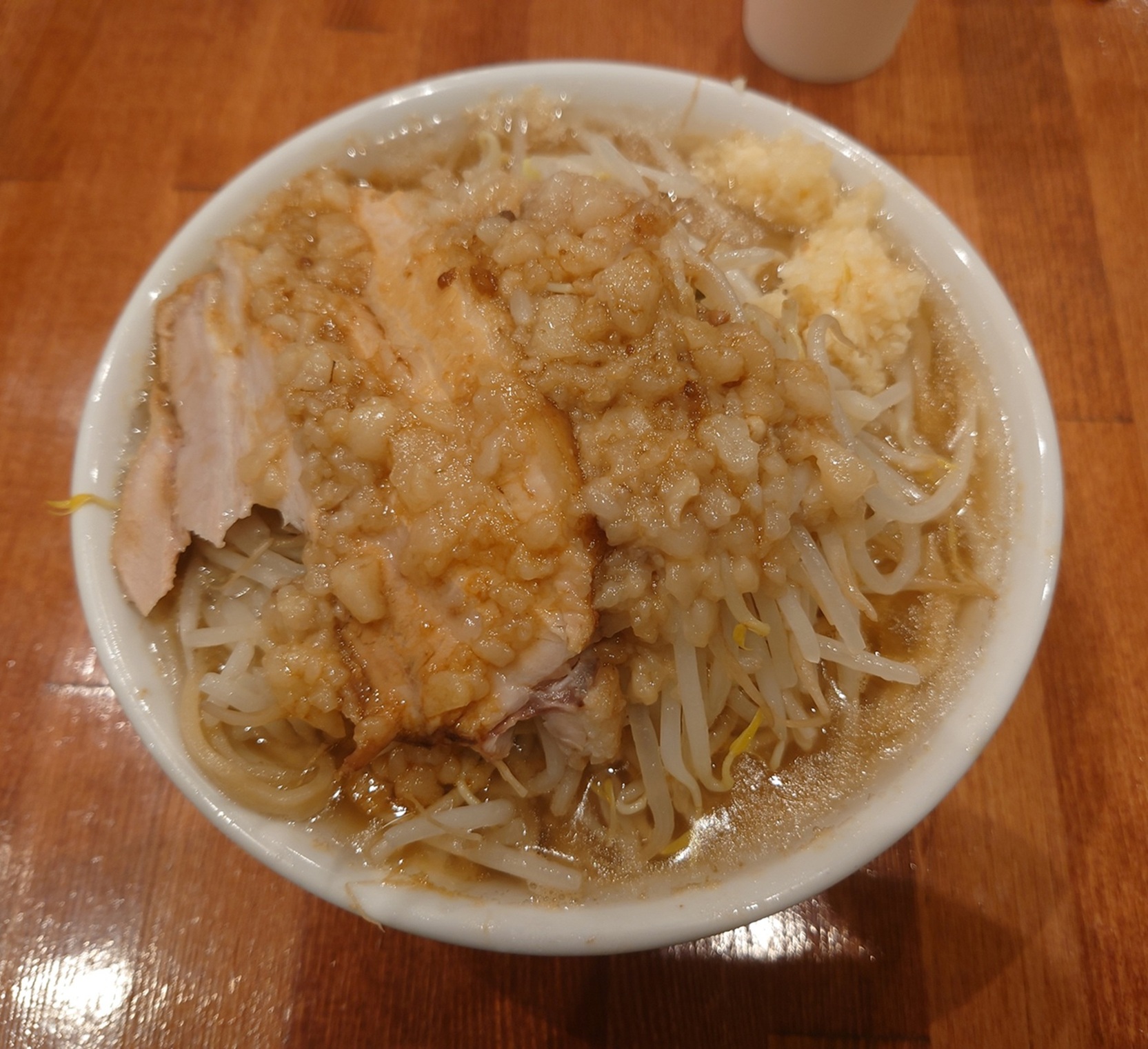 セカンドインパクトはなんといってもゴツい岩みたいな肉と大量の焦げた野菜炒めが特徴だった。それに比べれた優しいビジュアルだよね。ニンニクは巷の二郎系やG系同様てんこ盛り。