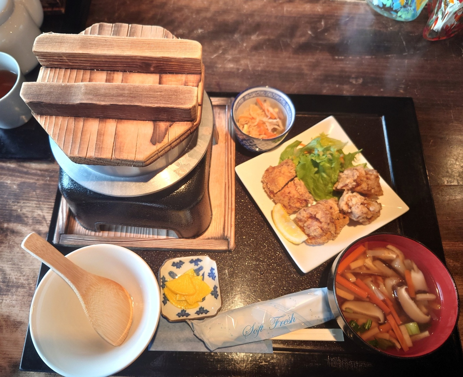 スープ。芳醇な味噌スープです。生姜とニンニクがホワーんときます。ため息がでるような美味さ。