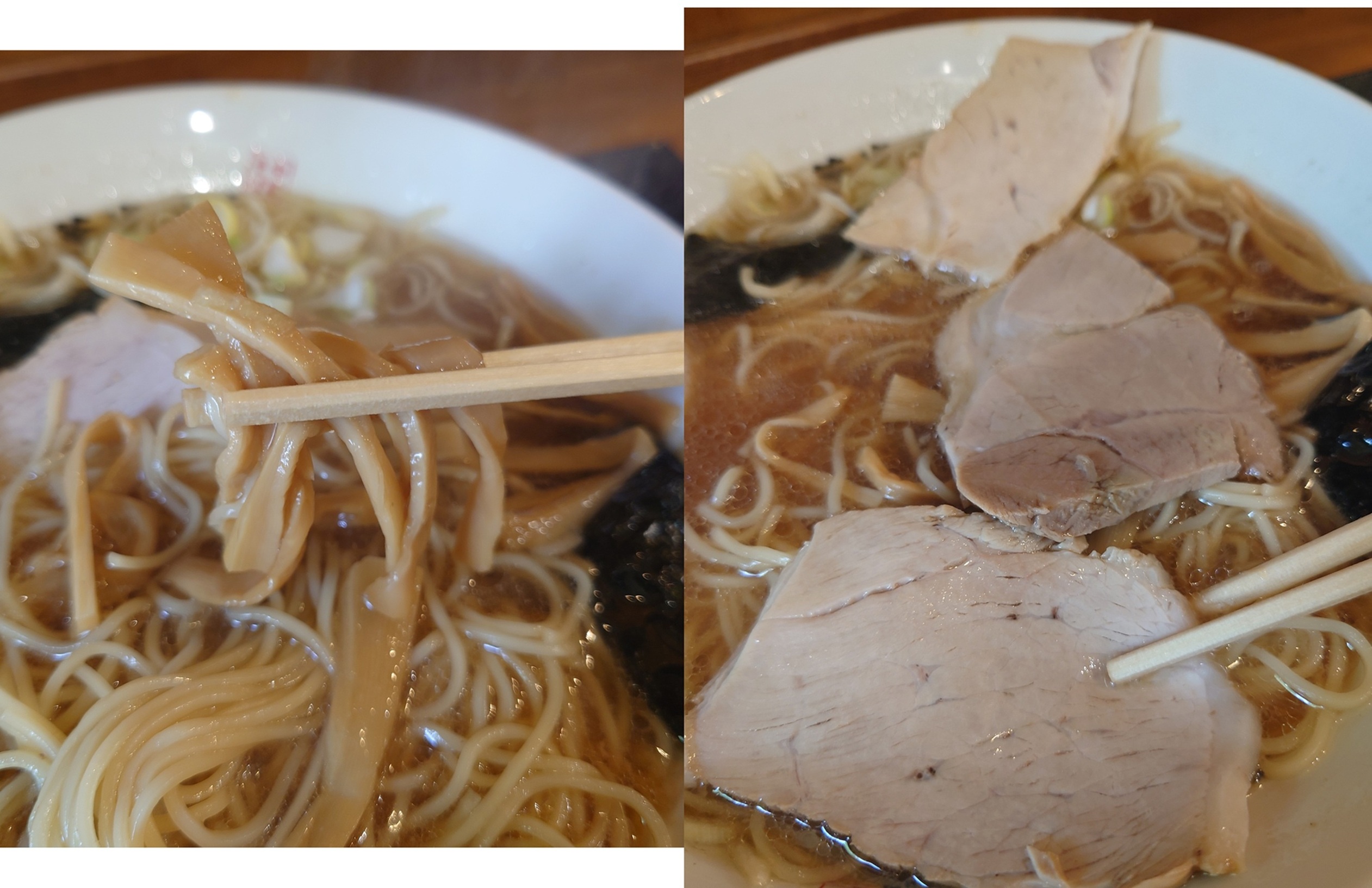 チャーシューは柔らかで優しい歯ごたえ。メンマは極太の存在感。
