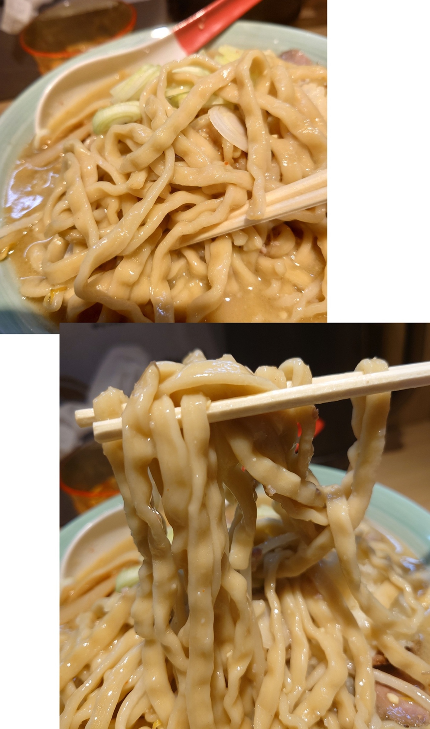 スープもお馴染みの乳化スープ。結構脂が浮いてますが毛決して非乳化というのではなく、乳化スープの上に更に大量の背脂が溶け出しているという感じだと思う(違ってたらごめんなさい。)(最近の「連坊店」もこんな感じ)