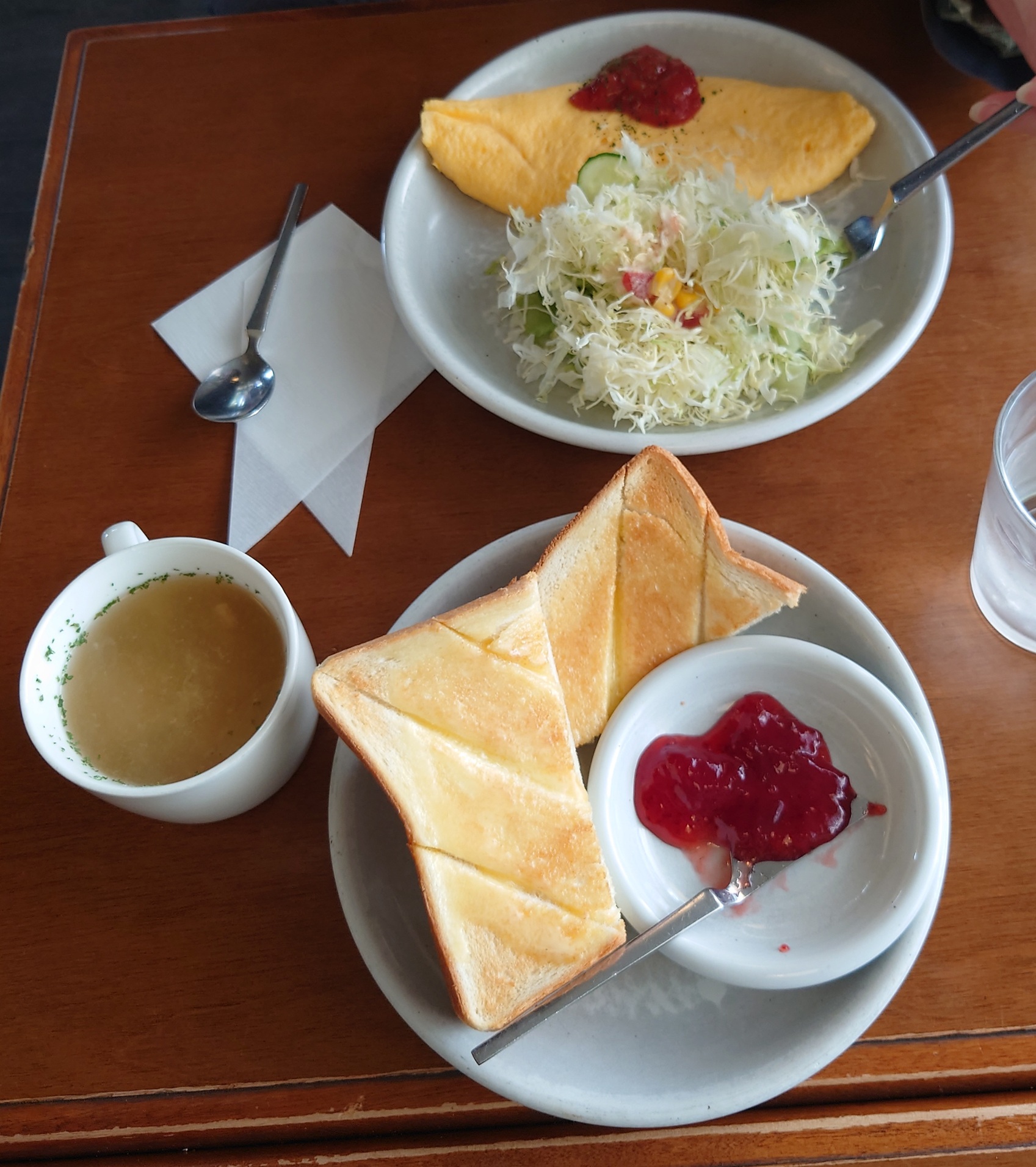 こんがり焼けた厚切りトーストに、とろとろのオムレツ、サラダ、コーヒーがセットになっています。トーストにはバターといちごジャムが添えられ、懐かしく優しい味わいが楽しめます。