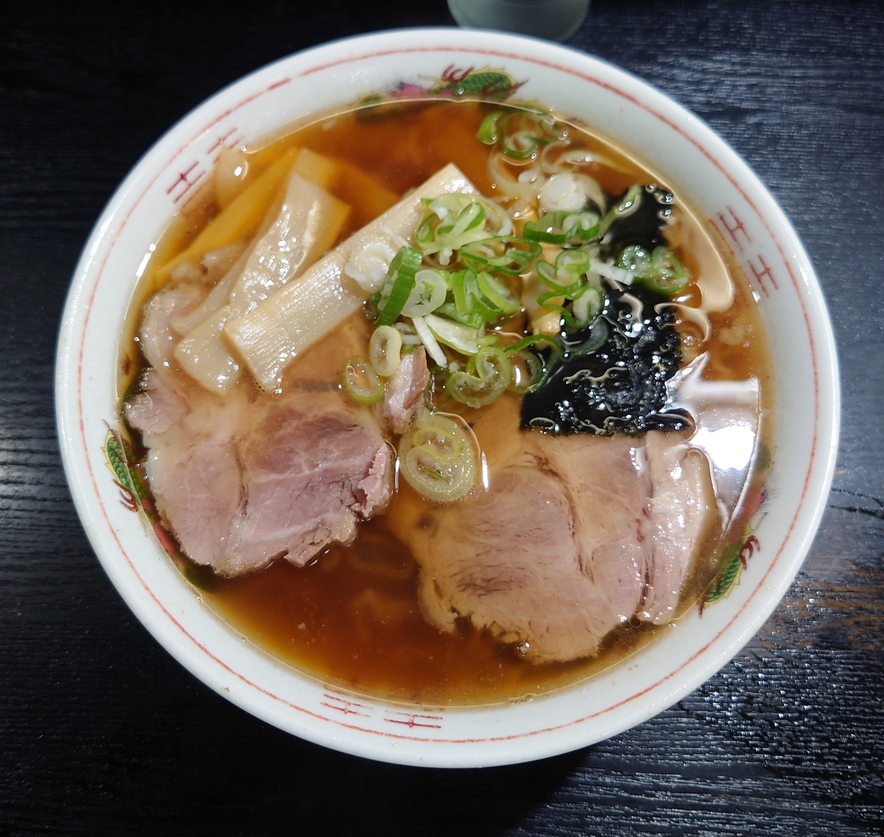 透明感のある醤油スープに細縮れ麺。具材はチャーシュー・メンマ・ネギ・海苔。